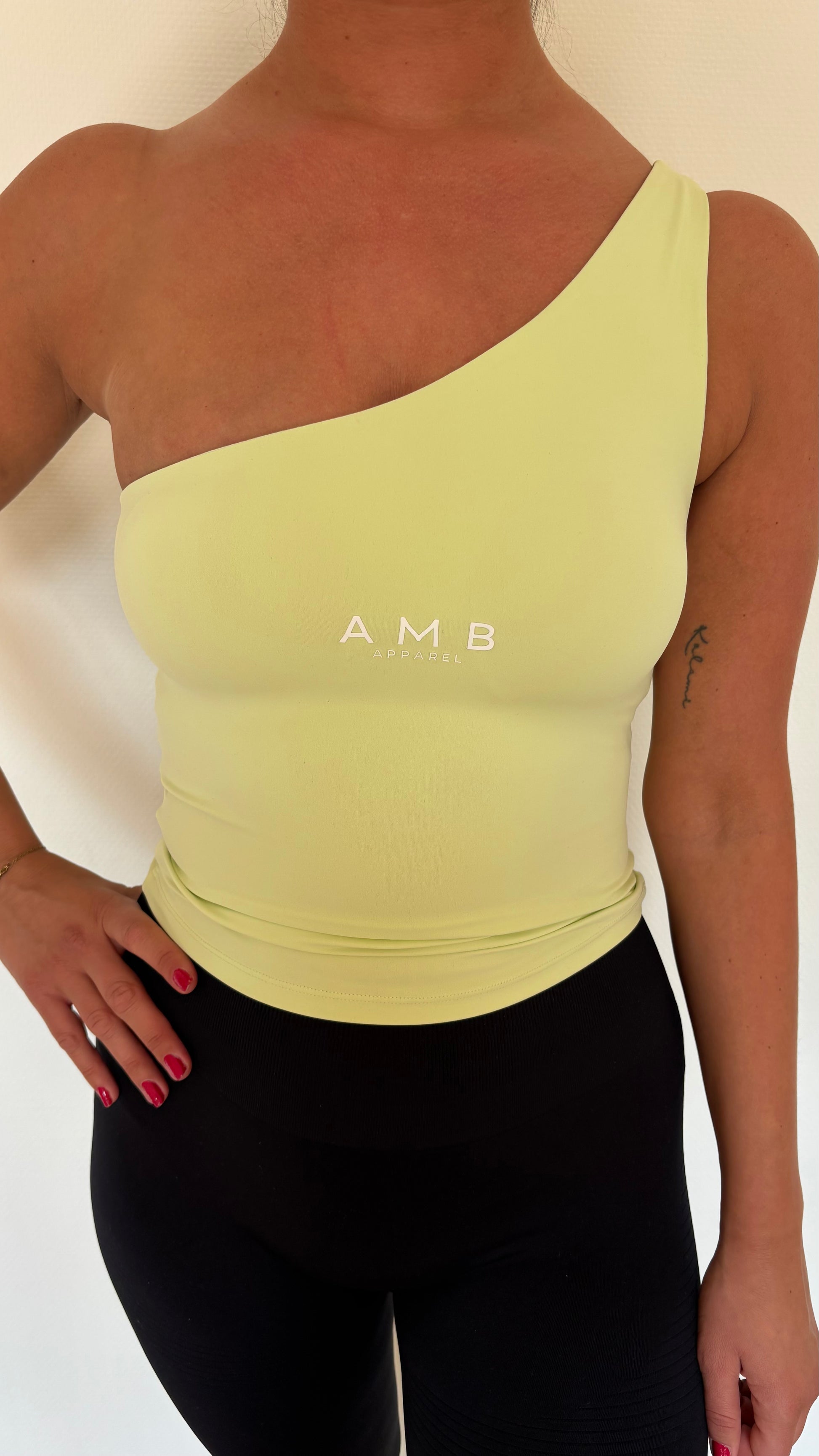 Sport top met één schouderband. Stevig en stretchy materiaal.